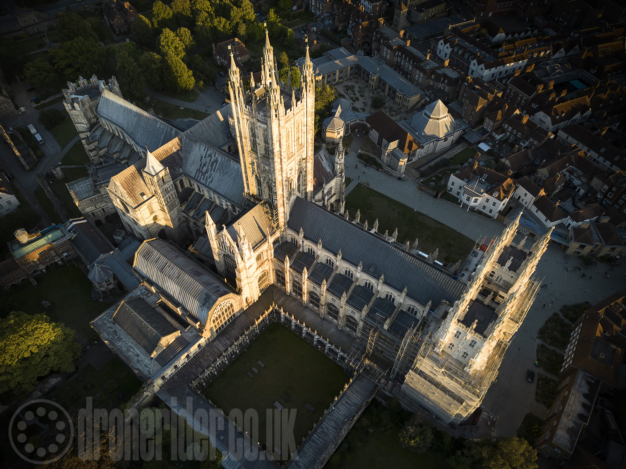 Aerial photograph of Canterbury Cathedral under the last sun's rays.