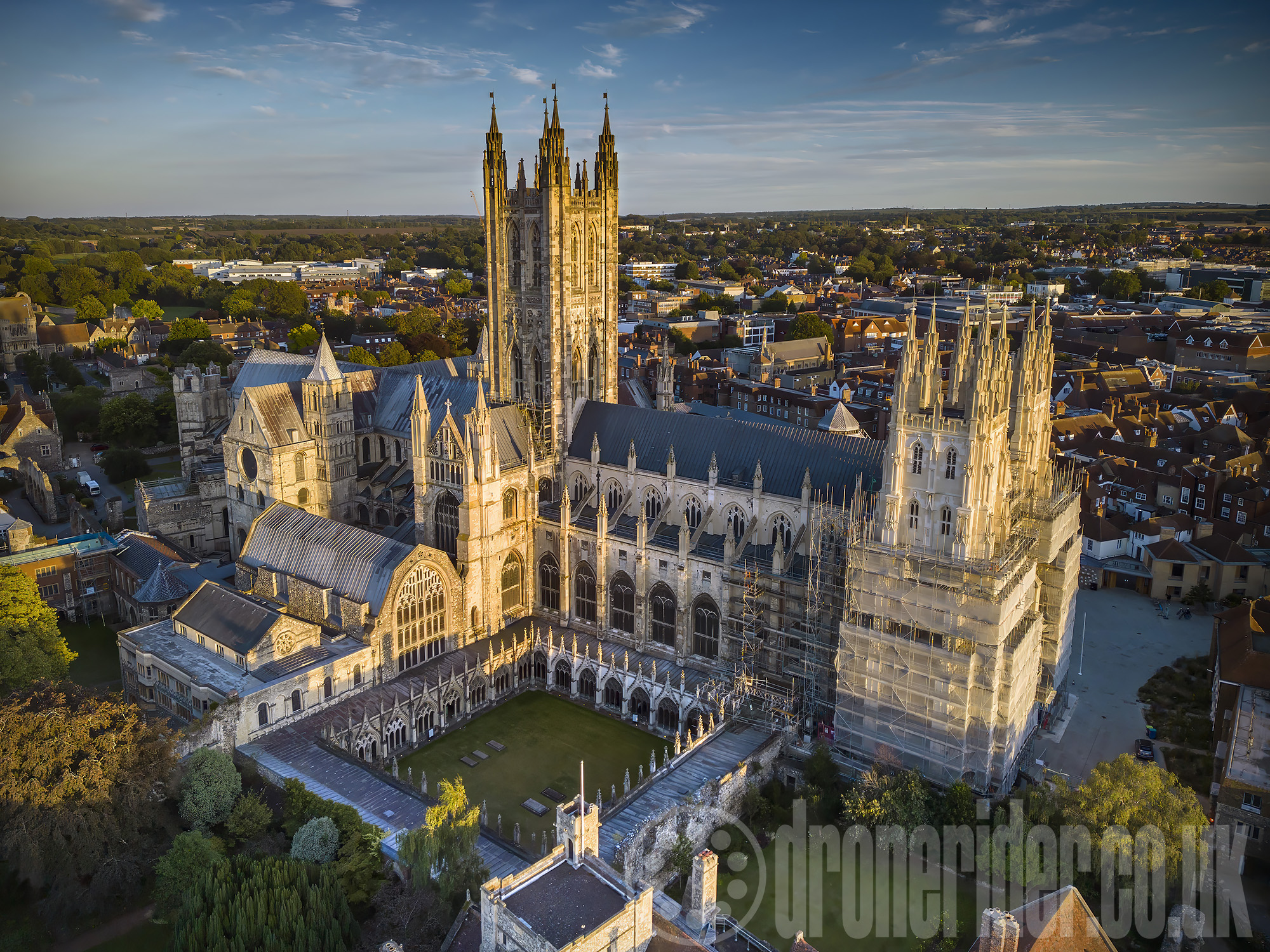 Aerial photograph of Canterbury Cathedral under beautiful evening light.